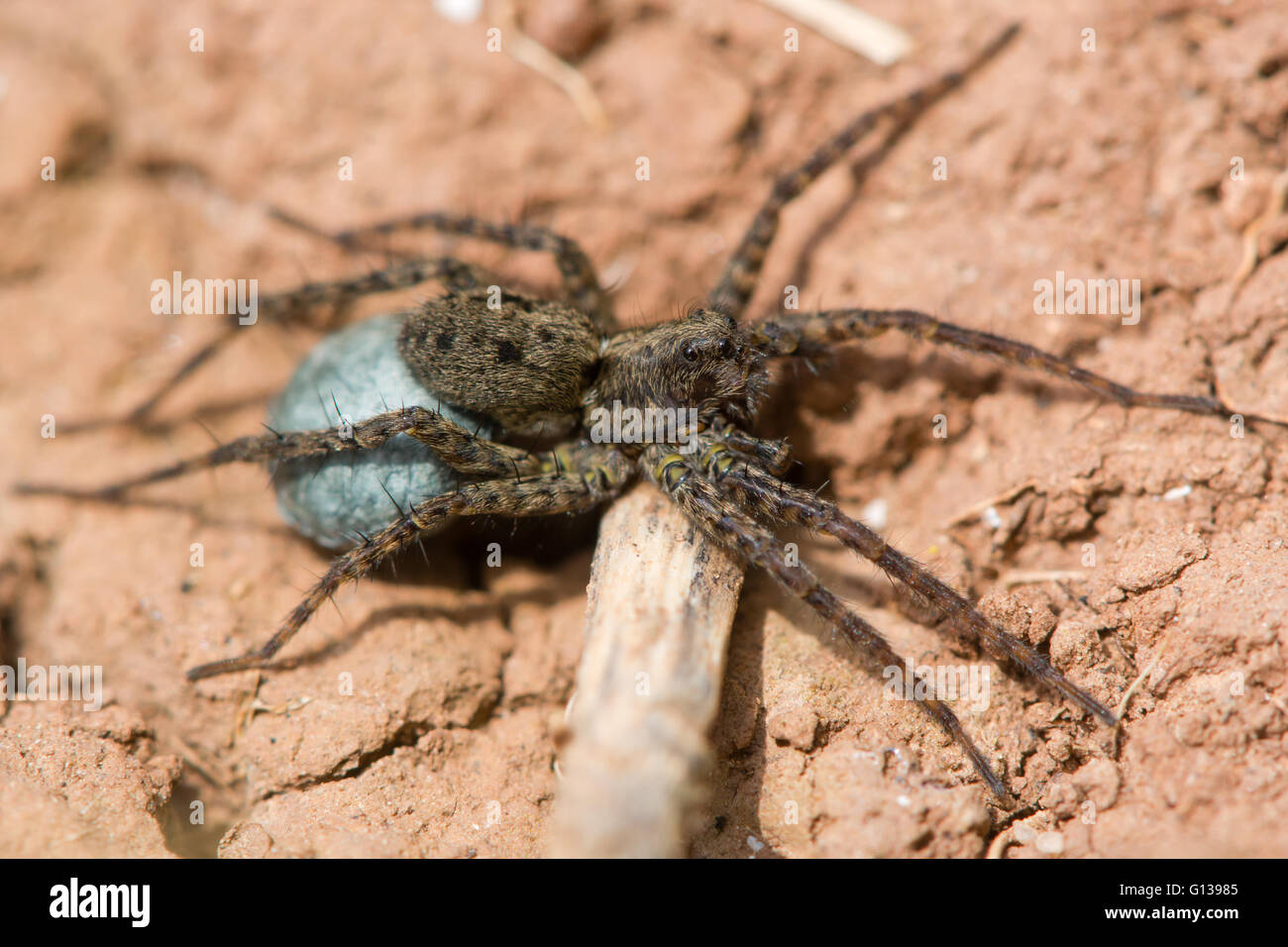 Wolf Spider Pardosa Sp Female With Egg Sac Blue Silk Containing Eggs Attached To Spinarets Of Female In Family Lycosidae Stock Photo Alamy